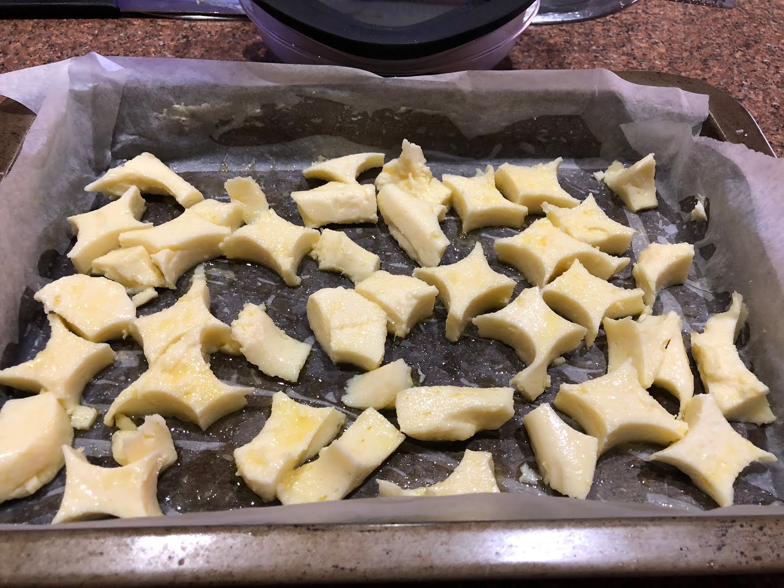 As I dislike waste of any kind, with the leftover bits I poured over some oil (I used a chilli infused olive oil) and grated some more parmesan over the top and baked them till crisp and golden.